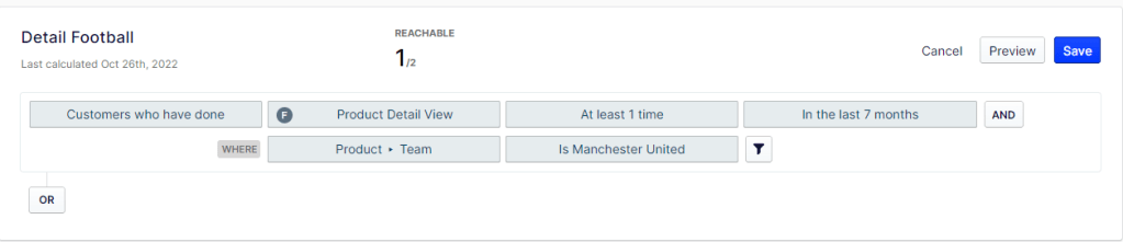 In our example, we will create a Segment of Customers who have viewed Products where the product has a custom attribute called “Team” and the value of that property is equal to “Manchester United”
