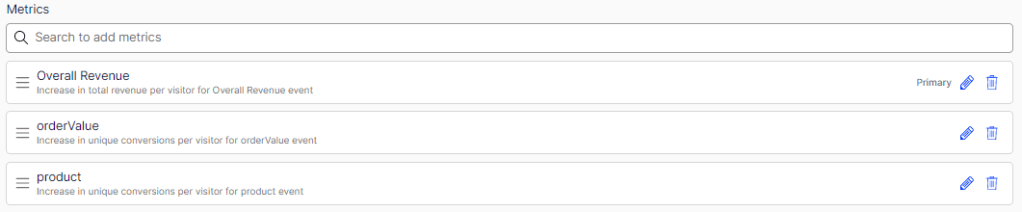 These metrics are what allows you to define what success is for your experiment. Quite a few come out of the box with this implementation so it’s worth checking out. The metrics for our experiment are: