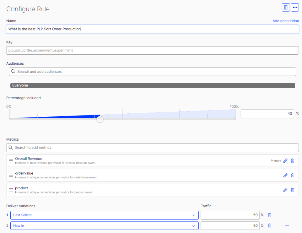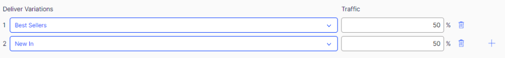 Here we define what variations of the experiment we want customers included in the Experiment audience to get. In our example we are running: